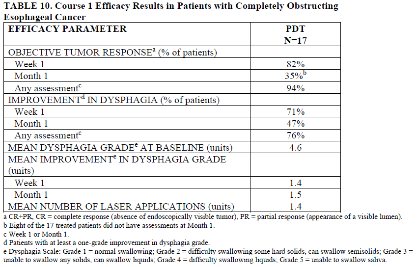 In a multicenter, single-arm study in 17 patients with completely obstructing esophageal carcinoma treated with PDT with PHOTOFRIN, after a single course of therapy, 94% of patients obtained an objective tumor response and 76% of patients experienced some palliation of their dysphagia.